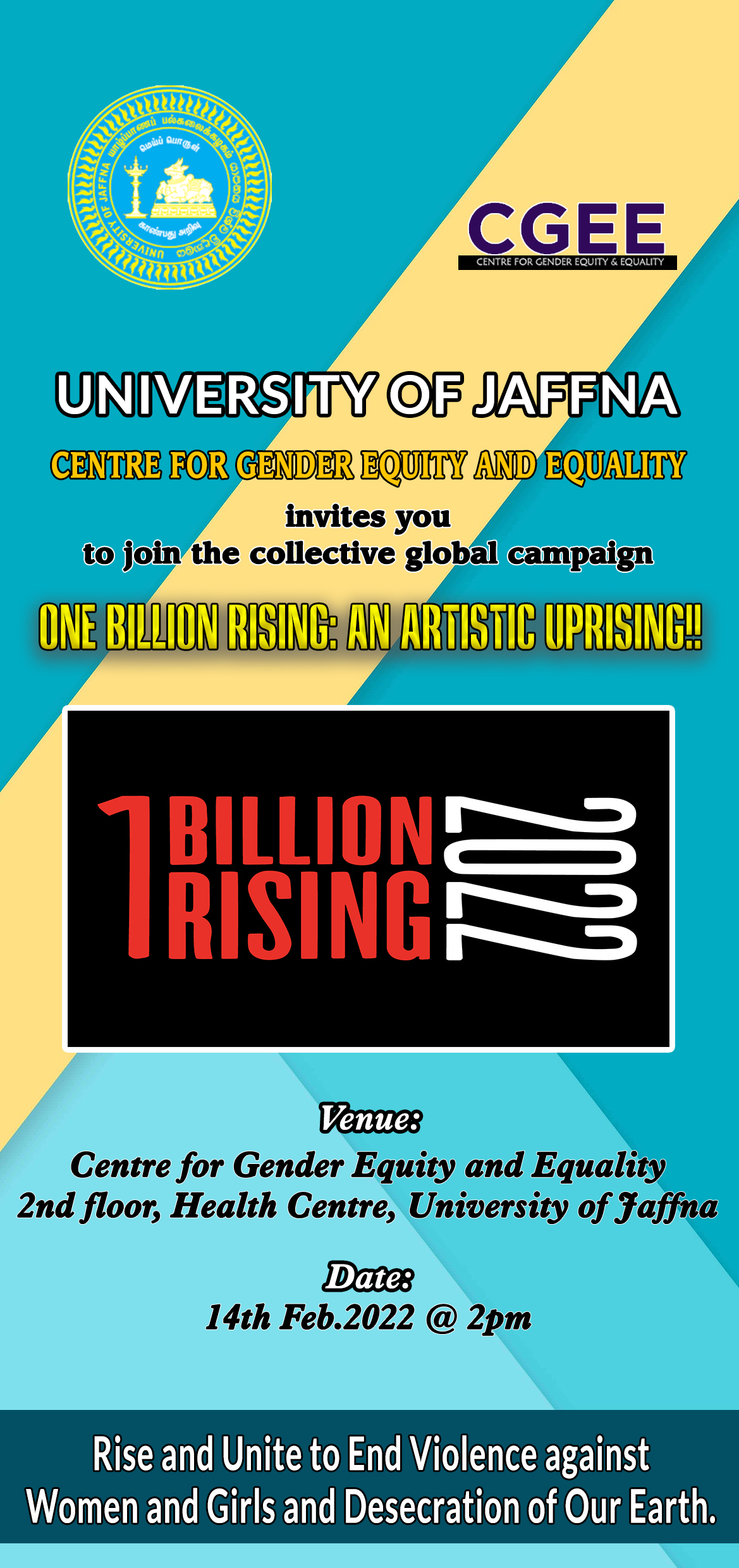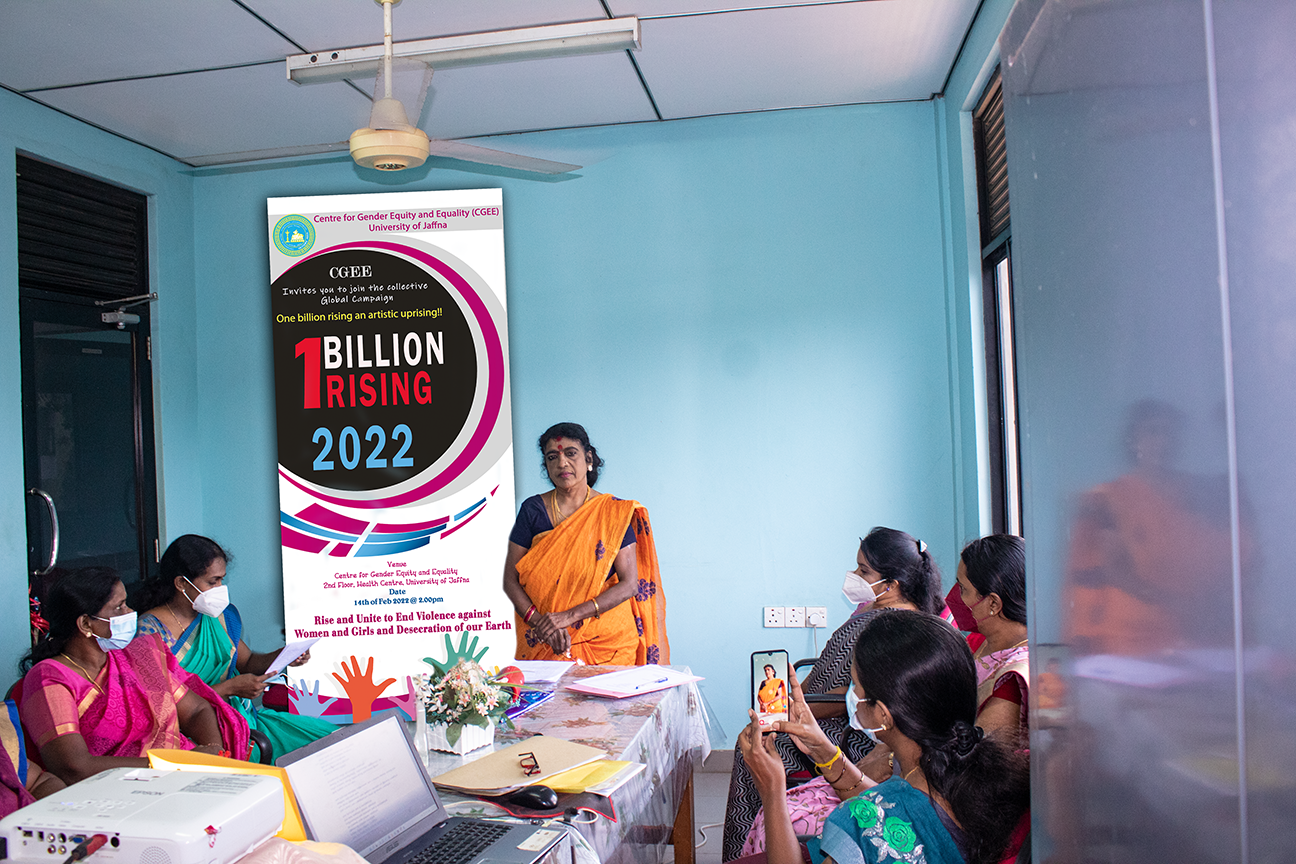 Centre for Gender Equity and Equality, University of Jaffna joined the collective global campaign One Billion Rising this year and it’s celebrated as an artistic uprising on 14th Feb.,2022 through poetry reading, storytelling and showcasing posters. CGEE created an impact through its participation in the global movement. The events took place with nearly 15 participants at the CGEE, UoJ on 14th Feb.2022 at 2pm.